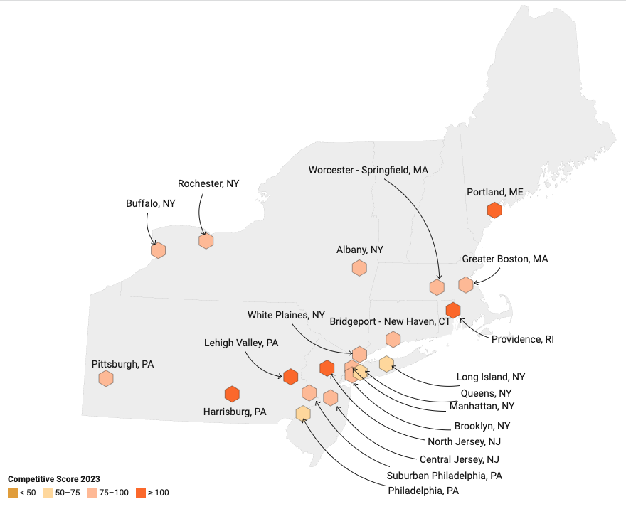 For example, renting in Suburban Philadelphia has become more financially attractive since the pandemic—largely due to remote work and the appeal of more space—making the area more and more competitive. Thus, in 2023, Suburban Philadelphia emerged as the second-hottest rental market in the Northeast and the eighth-hottest in the U.S. with an RCI score of 99.