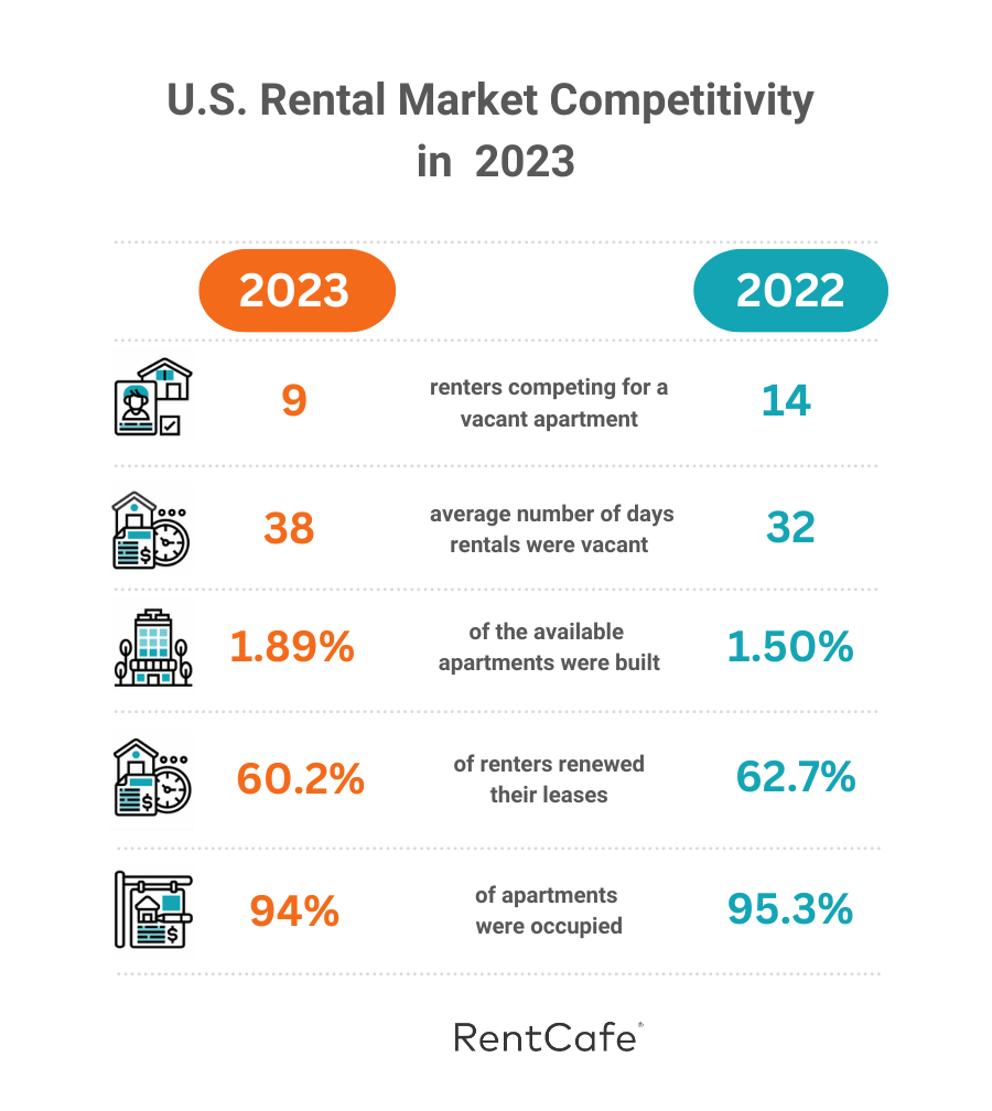 Furthermore, as new apartments surged this year, many renters chose to move out rather than renew their leases. More precisely, 60.2% of renters decided to stay put in 2023 as opposed to the 62.7% of renters who renewed their leases at the end of 2022.