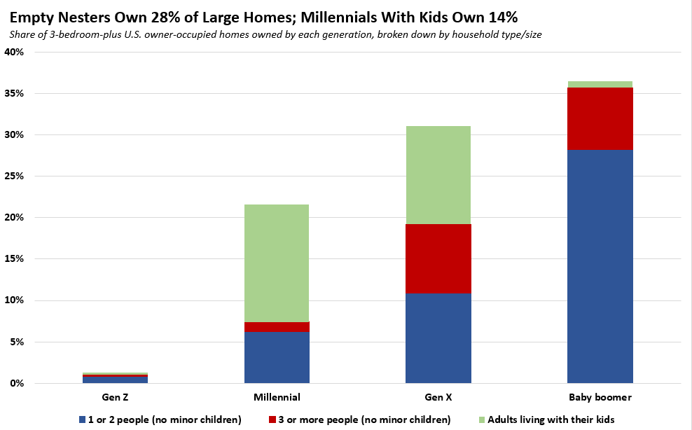 Some 45% of empty nesters own big homes, almost double the share of millennials with kids.