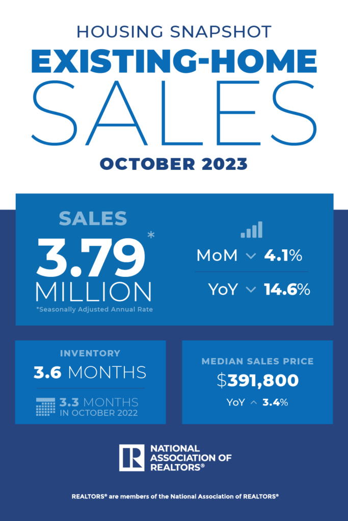 According to the newest Existing-Home Sales housing snapshot covering the month of October published by the National Association of Realtors (NAR), existing-home sales dropped 4.1% month-over-month and 14.6% year-over-year.