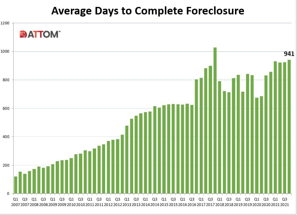 The average length of time of a foreclosure takes stands at 941 days nationally, with the highest amounts of time being found in Hawaii (2,491 days); New York (1,529 days); Pennsylvania (1,502 days); Louisiana (1,476 days); and Florida (1,378 days).