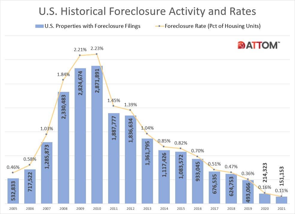According to ATTOM's report, the 151,153 properties with foreclosure filings in 2021 "represented 0.11% of all U.S. housing units, down from 0.16% in 2020 and down from a peak of 2.23% in 2010."