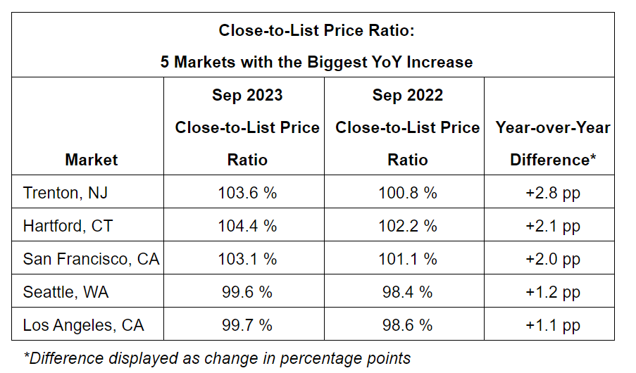 - Close-to-list price ratio (average of 50 metro area prices where the average value of the sales price divided by the list price for each closed transaction): In September 2023, the average close-to-list price ratio of all 50 metro areas in the report was 99%, flat compared to both August 2023 and September 2022. The close-to-list price ratio is calculated by the average value of the sales price divided by the list price for each transaction. When the number is above 100%, the home closed for more than the list price. If it's less than 100%, the home sold for less than the list price. The highest close-to-list price ratios were a tie between Hartford, Connecticut and Trenton, New Jersey at 104%, followed by San Francisco at 103%. The metro areas with the lowest close-to-list price ratio were Miami, Florida at 95%; and Coeur d'Alene, Idaho at 96%.