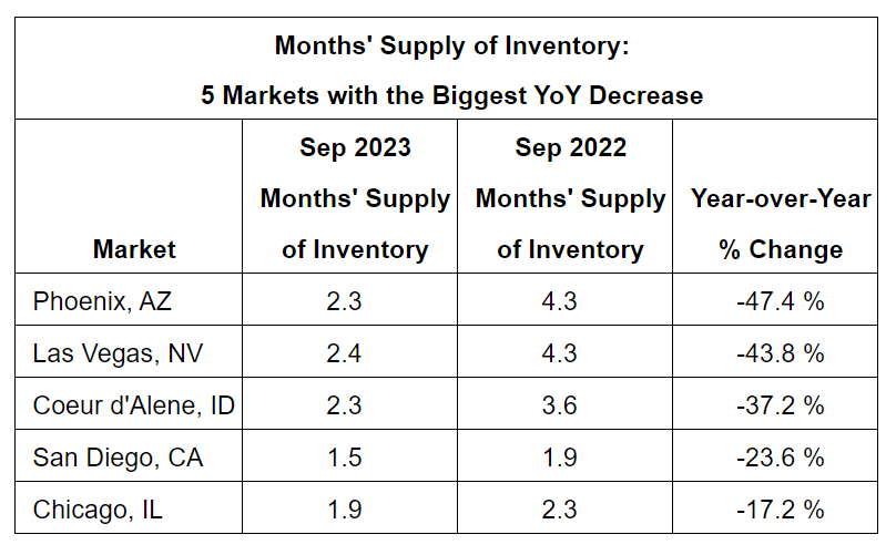 - Months' supply of inventory (average of 50 metro areas): The number of homes for sale in September 2023 was up 9.3% from August 2023, and down 8.6% from September 2022. Based on the rate of home sales in September 2023, the months' supply of inventory was 2.1, up compared 1.7 in August 2023, and increased compared to 2.0 in September 2022. In September 2023, the markets with the lowest months' supply of inventory were a tie between Hartford, Connecticut and Trenton, New Jersey at 0.9. The markets with the highest months' supply of inventory were found in Bozeman, Montana at 5.1; San Antonio, Texas at 4.6; and Houston, Texas at 3.9.