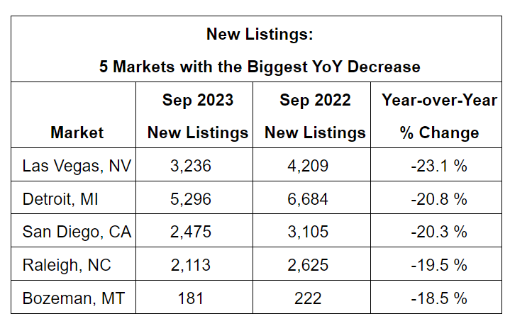 - New listings: Of the 50 metro areas surveyed in September 2023, the number of newly listed homes is down 1.8% compared to August 2023, and down 7.8% compared to September 2022. The markets with the biggest decrease in year-over-year new listings percentage were Las Vegas at -23.1%; Detroit at -20.8%; and San Diego at -20.3%. The markets with the biggest year-over-year increase in new listings percentage were San Francisco at +16.2%; Tampa, Florida at +15.8%; and San Antonio, Texas at +14.9%.