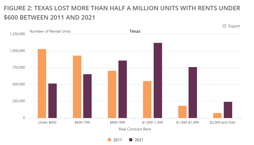 A $600 rent is the maximum amount affordable to households who make $24,000 annually. Additionally, the market lost 1.5 million units with rents between $600 and $799, and 980,000 units with rents between $800 and $1,000 in the same years.