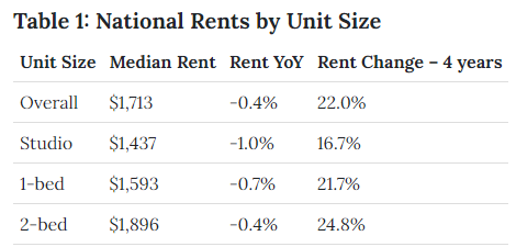 The median asking rent for all apartment sizes now sits at $1,713, down by a paltry $4 from last month and $63 (-3.5%) since the price peak in July 2022. However, this number is still $309 higher, or 22%, from numbers recorded before the pandemic.