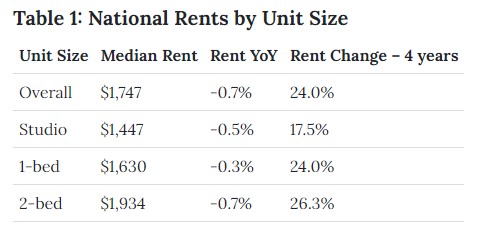 Again, September marked the fifth month of falling rent prices; the median asking price for a two-bedroom unit declined 0.7% in September to a median rate of $1,934 on a national scale which is $35 less than the market peak a year ago. Nevertheless, the larger unit rents had the highest growth rate over the past four years, up by $403 (26.3%).